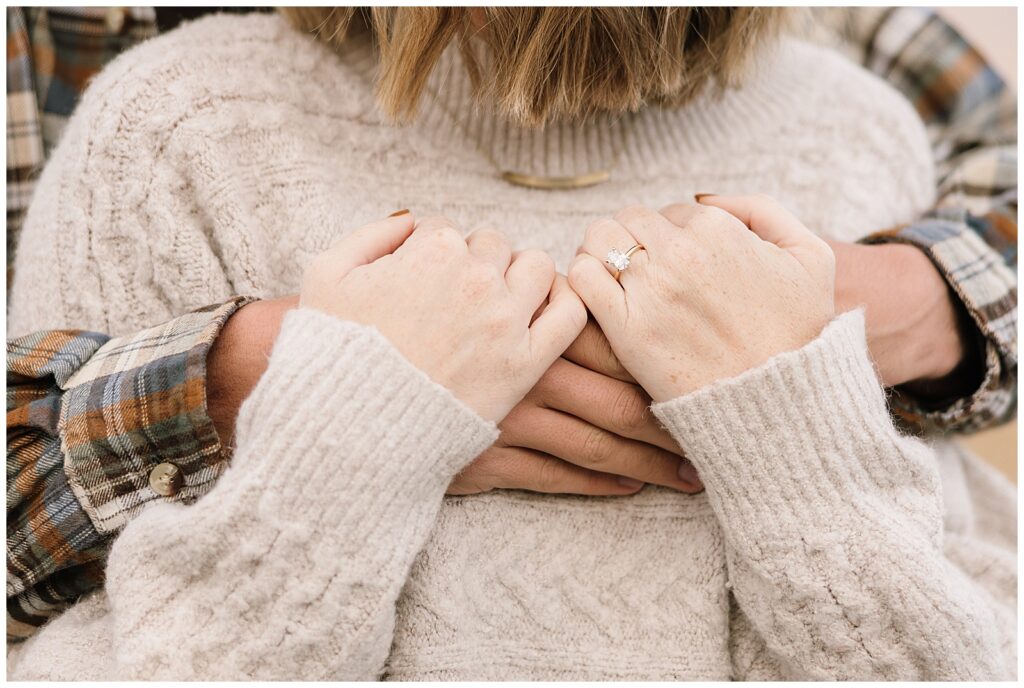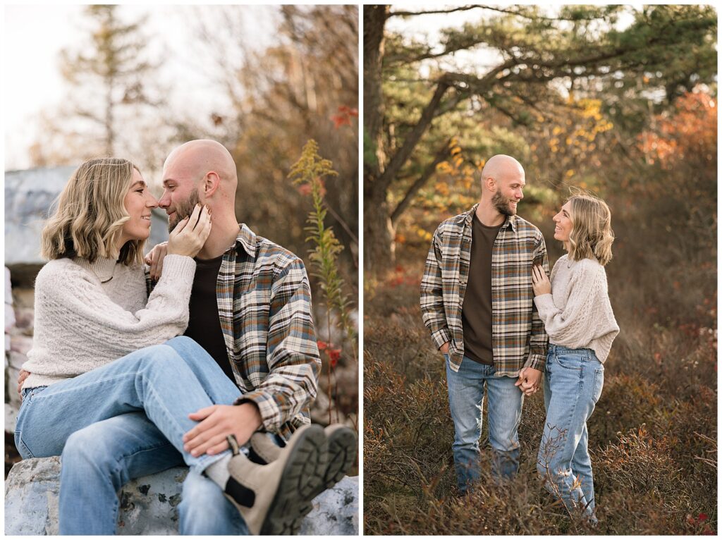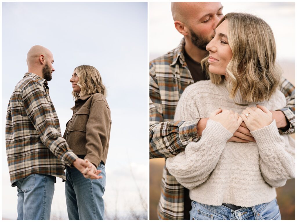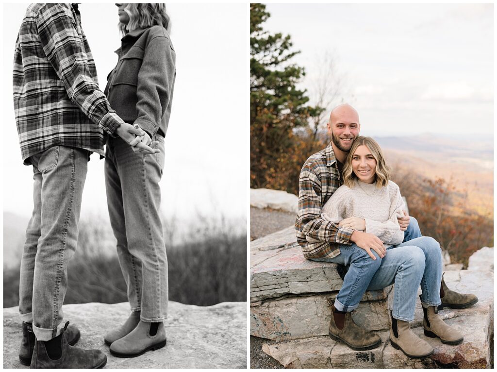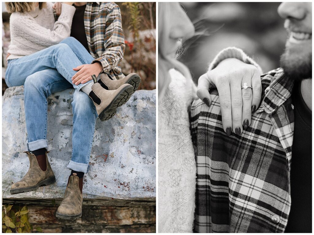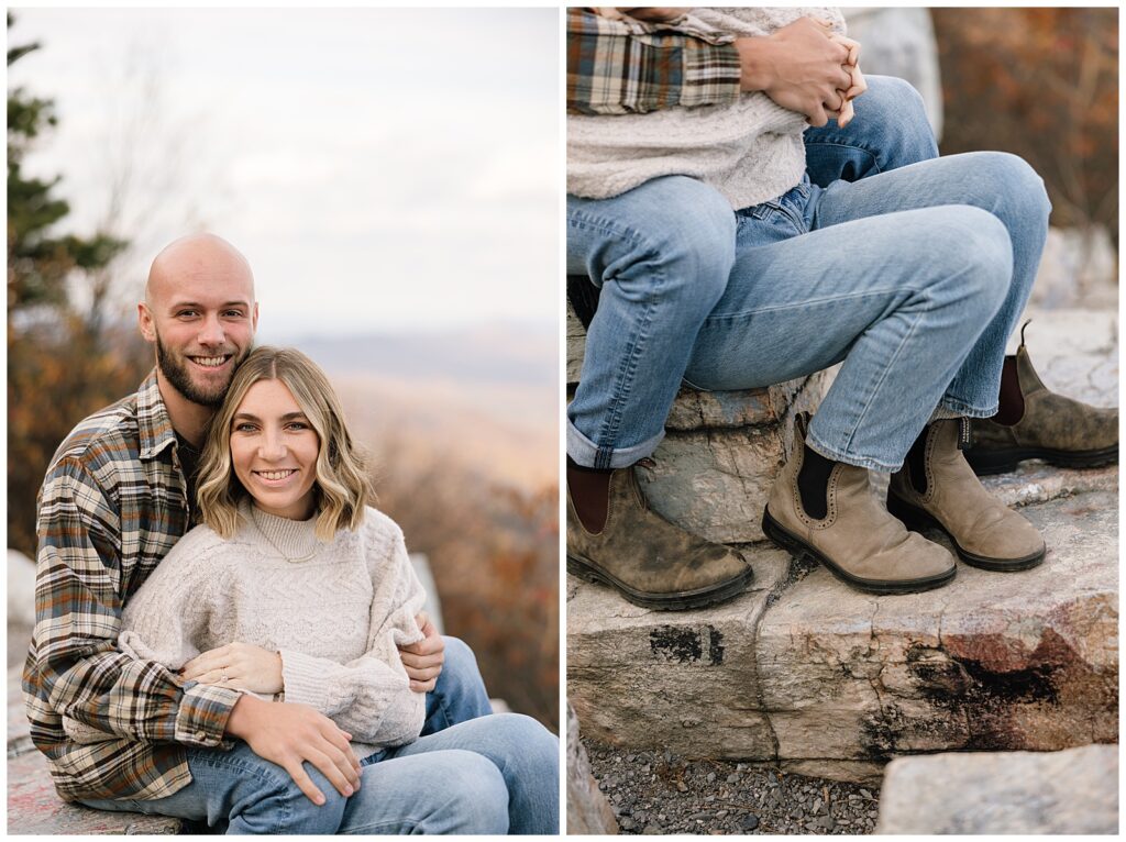 Cowans Gap was the perfect backdrop with the fall leaves and rolling mountains in the distance. We had a great evening wandering around, finding neat spots, and laughing together! We focused on their natural connection and deep adoration for each other for their engagement session. I wanted the photos to feel like themselves, and like they were pulling on their favorite sweater – comfy and familiar. The warm tones of the fall leaves and their neutral-toned outfits really pulled the session together. The best part? We all matched in our favorite Bludstones! You can snag your own pair here!
